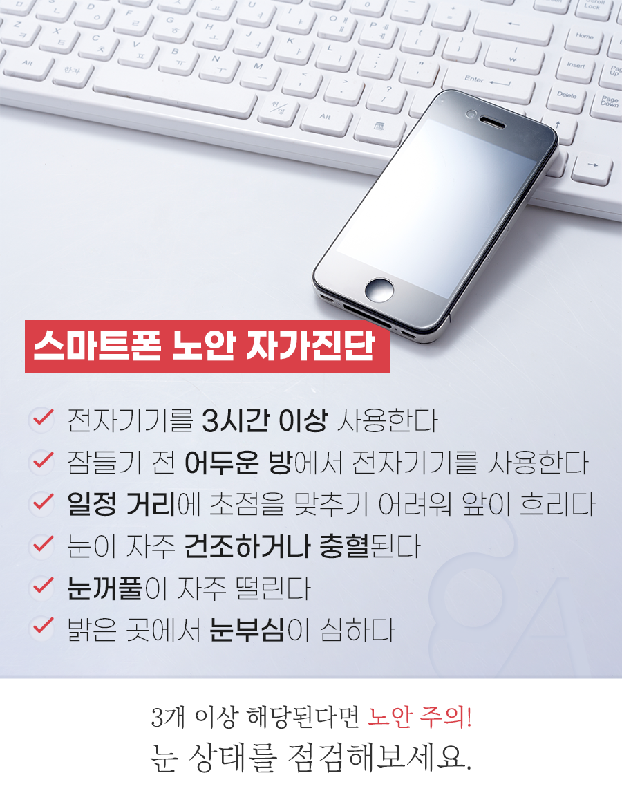 평소 책을 많이 보거나 전자기기를 많이 사용하는 분이라면 스마트폰 노안 자가진단 해보세요. 6가지 보기 중에서 3개 이상 해당된다면 이미 노안이 진행되고 있을 수 있습니다. 해당되는게 많을수록 더욱 철저한 눈 관리가 필요해요. 눈의 피로를 풀어주고 눈을 쉬게 해주어야 합니다.