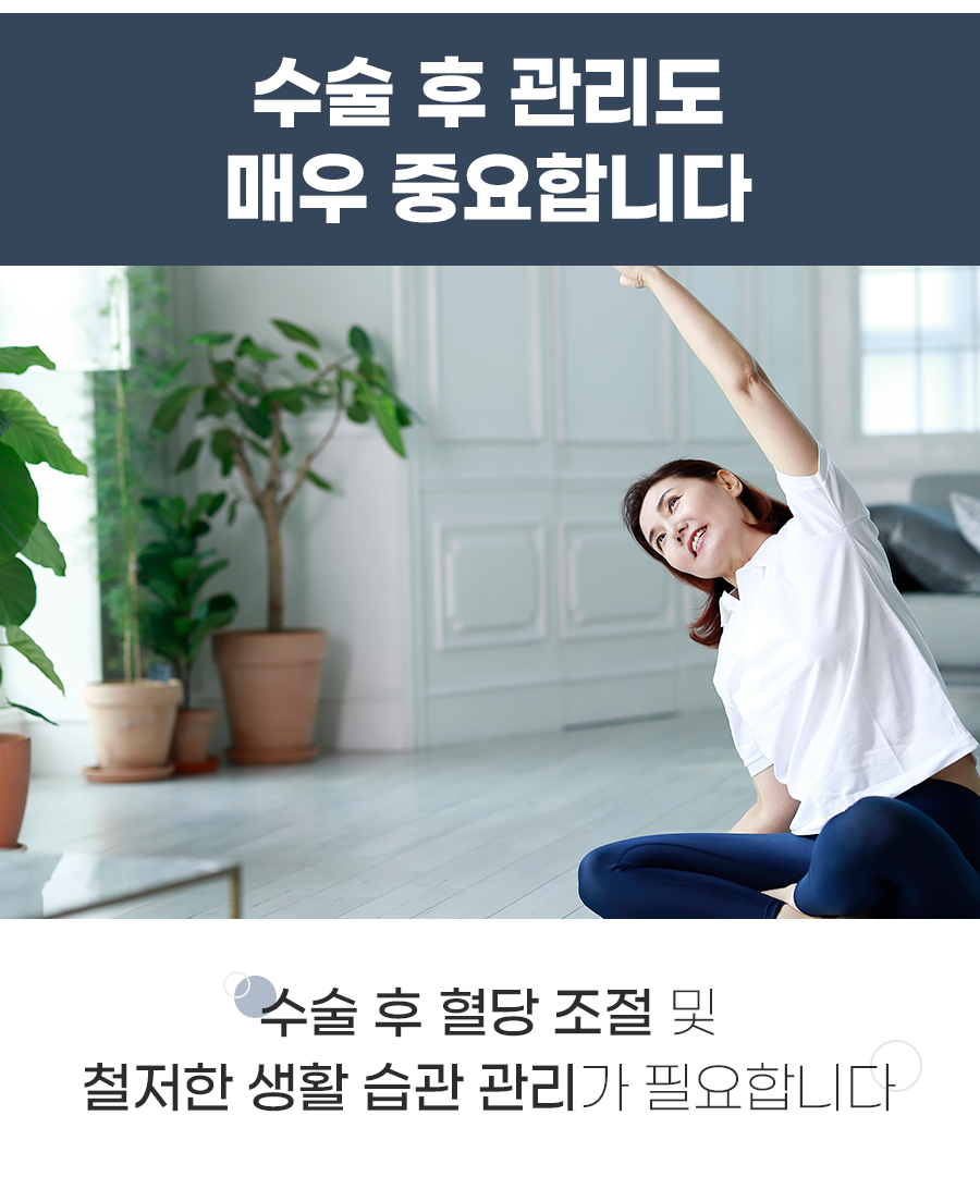 또한 백내장 수술 전에는 혈당수치가 정상적이었어도, 막상 수술 후 관리가 제대로 이뤄지지 않는다면 세균에 감염되어 합병증으로 나타날 수 있습니다. 그래서 수술 후 혈당 조절 및 생활 습관 관리 역시 매우 중요한데요. 혈당을 조절하는 가장 현명한 방법이 생활 습관 관리이기 때문에 주치의의 안내에 따라 지침을 지켜나가는 환자의 의지가 필요합니다.