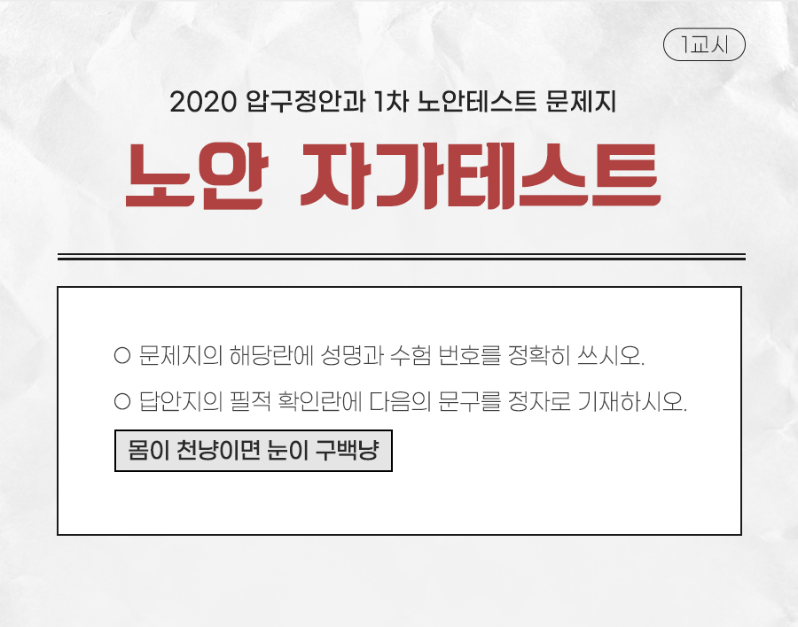 안녕하세요. 오늘은 구독자분들의 눈 건강이 염려되어 압구정안과와 함께 노안 테스트를 해보려고 합니다. 답안지의 필적확인란 확인하셨나요? ‘몸이 천냥이면 눈이 구백냥’ 이라는 말처럼 눈 건강! 중요한 거 아시죠? 지금부터 테스트 시작하겠습니다 !