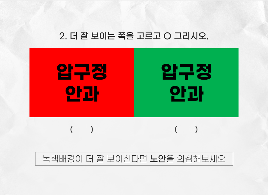 양 쪽 빨간색과 녹색 중 어느 배경이 더 선명하게 보이시나요? 빨간 바탕 쪽이 더 잘 보인다면 아직 노안을 걱정하지 않아도 되지만, 녹색 바탕이 좀 더 잘 보이신다면 노안이 염려되니 안과에 방문 하셔서 정확한 노안 검사를 해보는 것이 좋겠습니다.