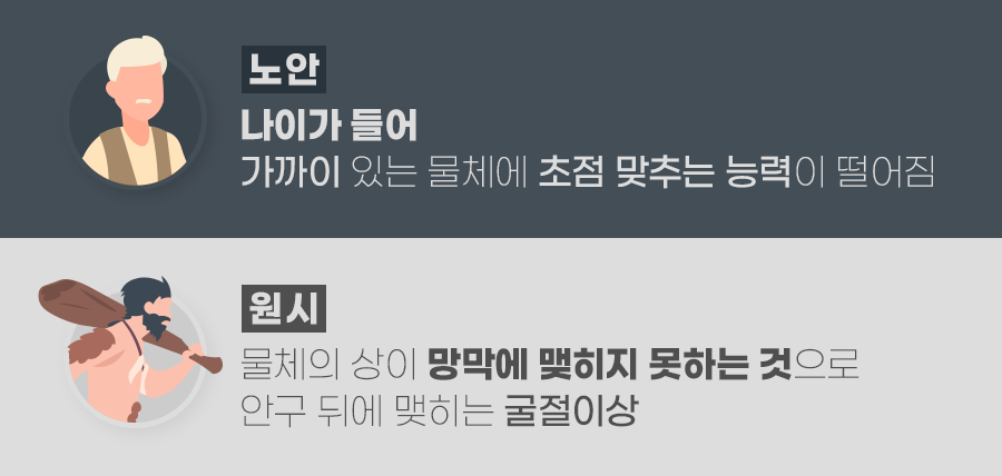 원시는 흔히 겪는 난시나 근시와 같이 시력이 좋지 않은 사람들이 보이는 눈의 굴절이상이라고 할 수 있고, 노안은 수정체의 탄력이 줄어들어 제기능을 하지 못하는 기능 이상이라고 할 수 있습니다.