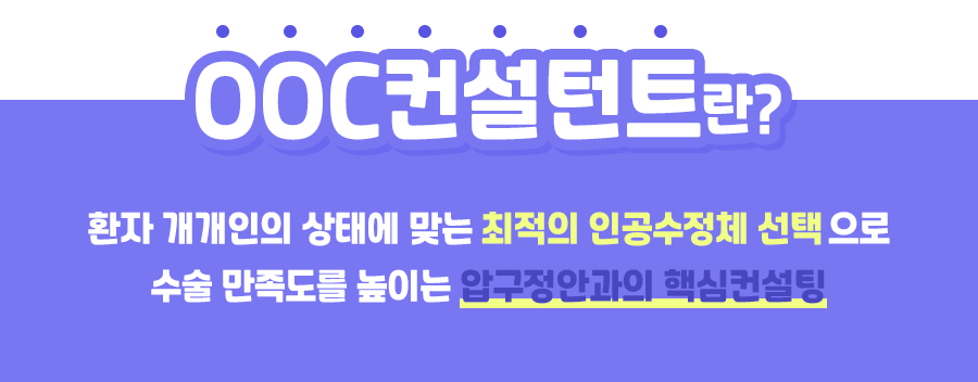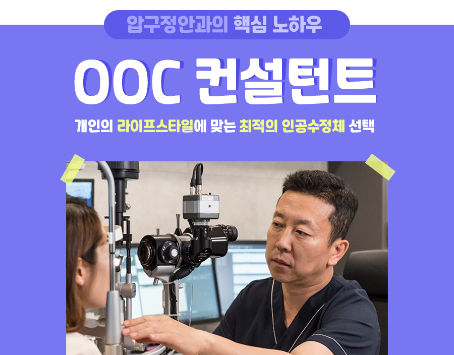 이렇듯 OOC컨설턴트란 1:1 백내장 검진을 통해서 이러한 모든 환경들을 고려하면서 환자에게 최상의 시각적인 관리 시스템을 제공함으로써 내 눈에 꼭 맞는 인공수정체를 선택할 수 있게 도와드리는 압구정안과의 핵심 컨설팅 시스템입니다.